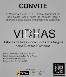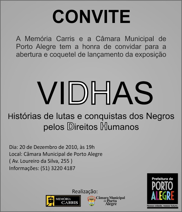 Convidamos a todos para o coquetel de abertura da exposição "VIDHAS: histórias de lutas e conquistas dos negros pelos Direitos Humanos", na Câmara Municipal de Porto Alegre, às 19h, no térreo.