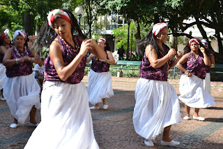 O dia do evento nos brindou com sol e uma temperatura de verão! Nossa primeira parada com o ônibus foi na praça Brigadeiro Sampaio, mais conhecida como a "Praça do Tambor". Lá realizamos uma ciranda organizada pelo professor Vanderlei de Paula Gomes, Coordenador das Relações Étnicos e Raciais da SMED/Porto Alegre. O segundo ponto do percurso foi nas escadarias da Igreja Nossa Senhora das Dores. Além da fala das duas historiadoras que participam do projeto, também foi realizada uma roda de capoeira pelo nosso colega de empresa Mestre Pelezinho e seus alunos. O público ficou bastante impressionado com a destreza e a prática demonstrada pelo pessoal do Mestre Pelezinho!
